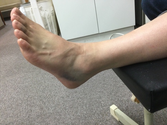 写真は初診時の外観写真ですが、外果(外くるぶし)よりもやや前下方に腫脹と皮下出血が見られ、歩行時痛も強く認められました。