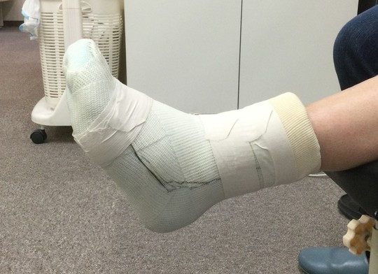 固定は足関節の少し上から指先まで含む部分のギプス固定を行い、痛みの強さによっては松葉杖を使わずに歩行が可能です。