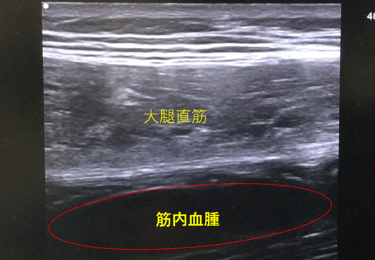 いわゆる打撲の中にはエコー画像のように筋肉内に血腫(赤〇部分)がみられるものが時々見られます。