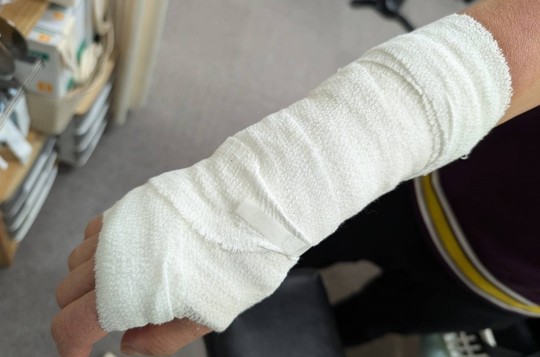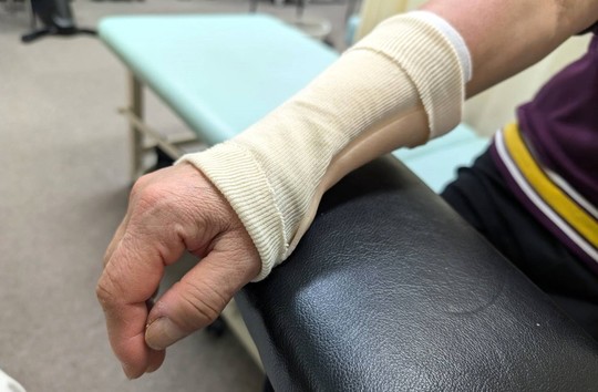 急性期は痛みが強く、特に手首の動きで強い痛みがみられるためオルフィットによるシーネ固定をしています。