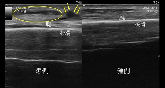 超音波観察(エコー)でも名前の通り腱が交差する部位に腫脹がみられます(エコー画像の〇、↓)。