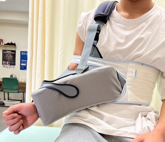 肩関節脱臼では徒手整復後に保存療法と手術の治療がありますが、今回は外旋位固定(写真)とよばれる保存療法で治療を行いました。