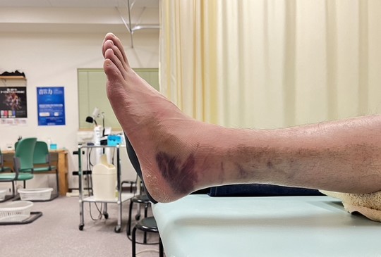 足首の外側部に強い腫脹と皮下出血がみられる。