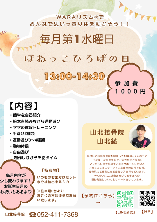 私も4人のママですが、1人1人成長に個人差があり、兄弟でも比べてしまったりして不安になる事が沢山ありました。子どもを連れて遊びに行けない日や、下のお子さんが生まれてなかなか上のお子さんと遊べなくなってしまう環境になってしまう中で、少しでもママとお子さんが楽しく体を動かして、年をとっても、大きくなっても、元気で丈夫な体を維持して頂きたいと思い、「ほねっこひろば」を始めました。