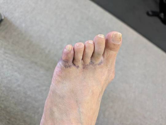 段差につまづいて左小指を受傷した方です。基節骨の骨折がみられたためオルフィットとよばれる固定具で固定を行っています。日常生活で足指のケガは多く見られますが、このように腫れがあり皮下出血により色が変わっているようなときは骨折が疑われます。