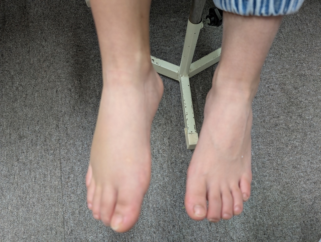 足部のリスフラン関節付近位に高度の腫脹を認め、荷重歩行は困難。