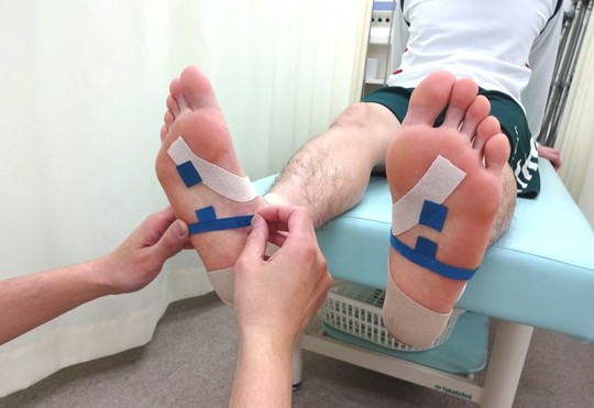 テーピングや足底パッドを用いて検査を行います。実際にテーピングやパッドも用いることで歩行や姿勢が良い状態に変化することを確認します。